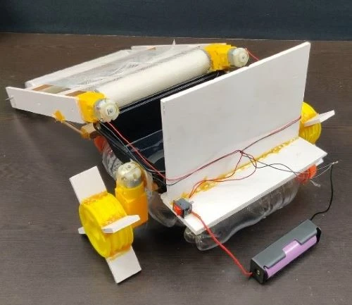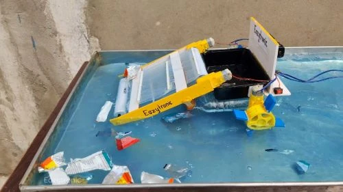 It moves on water, guides the floating waste toward a small conveyor or ramp, and stores it in a container.
