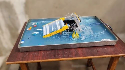 This model represents an water surface cleaning system that collects floating plastic waste (like wrappers, cups, bottles) from rivers, lakes, ponds, or harbors.